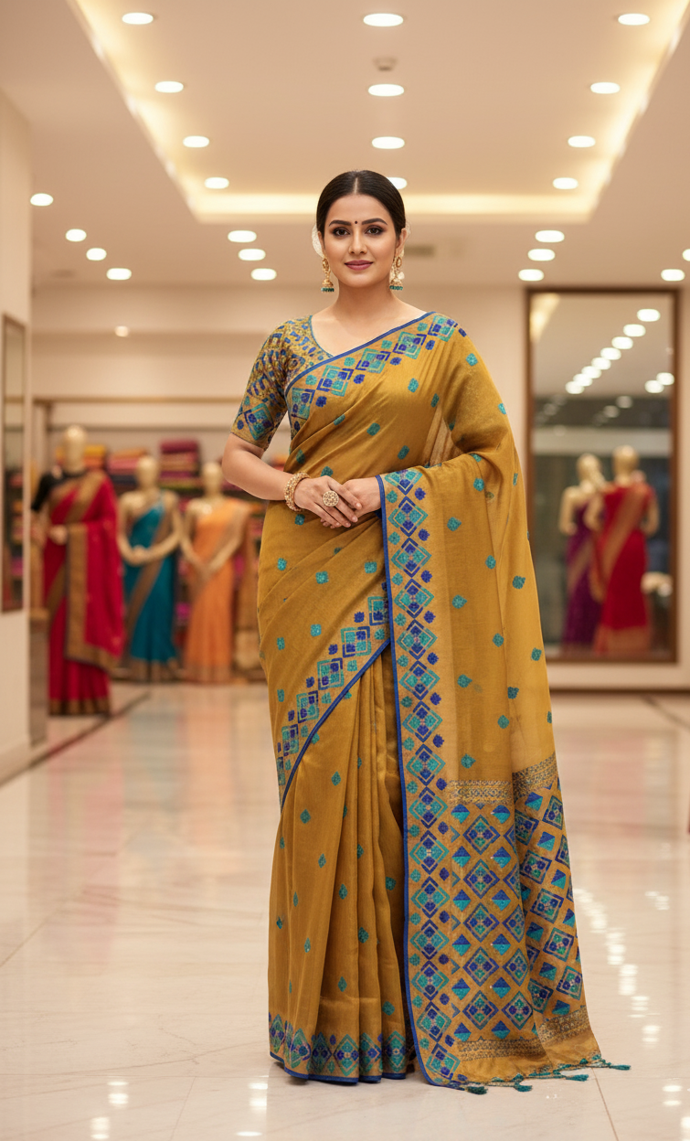 The rich mustard silk fabric provides a warm and luxurious base, exuding richness while allowing the embroidery to stand out in striking contrast. Known for its natural sheen and graceful drape, silk adds a regal charm, making this saree ideal for weddings, festive occasions, and cultural gatherings. The smooth texture ensures comfort while enhancing the overall grandeur of the garment.