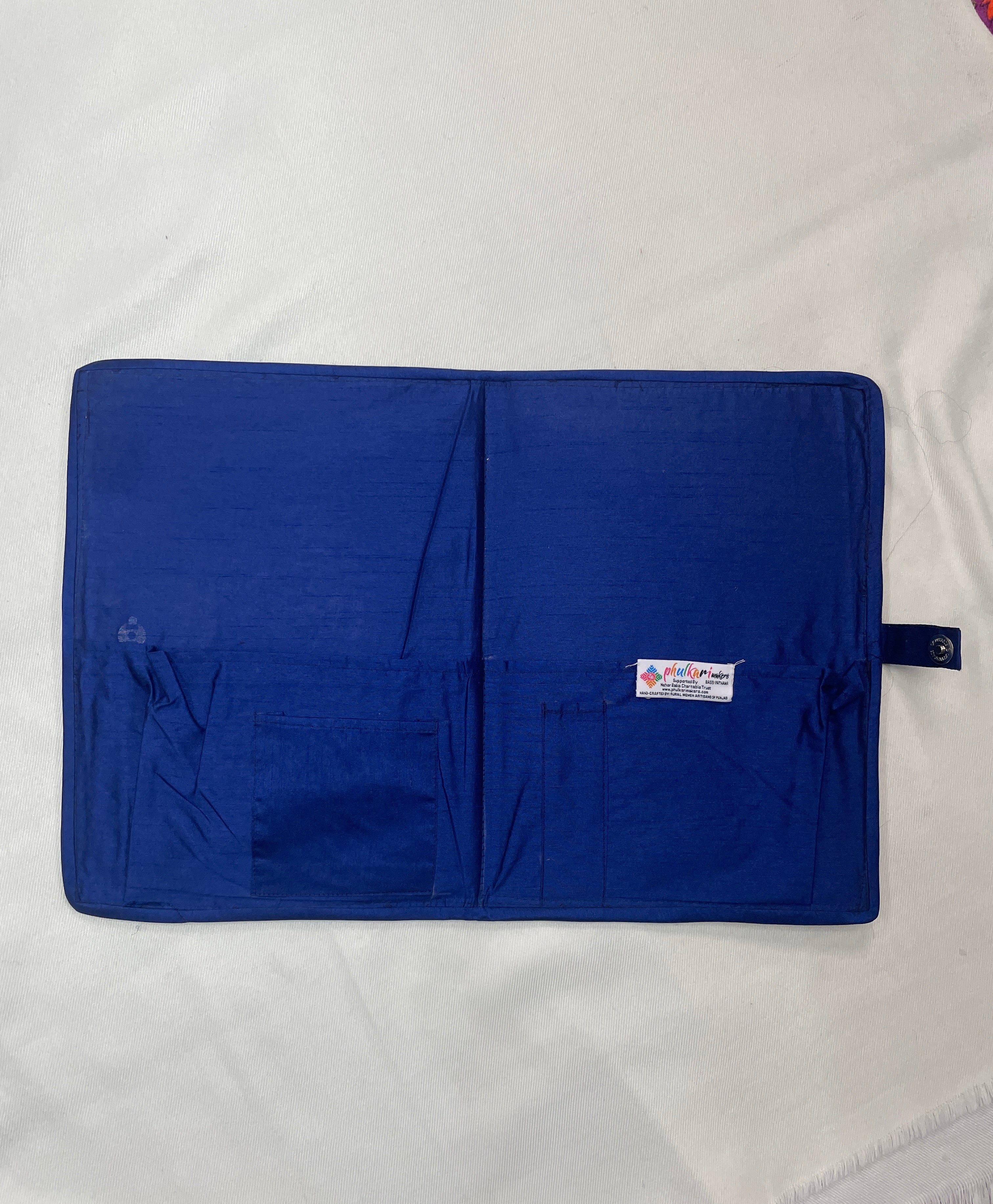 Keep your important papers organized in style with The Amritsar Store Handmade Embroidered Fabric Document File – Blue with Mirror Work. Crafted with care, this elegant document holder features a rich blue fabric base beautifully adorned with delicate embroidery and subtle mirror work that adds a touch of traditional charm.