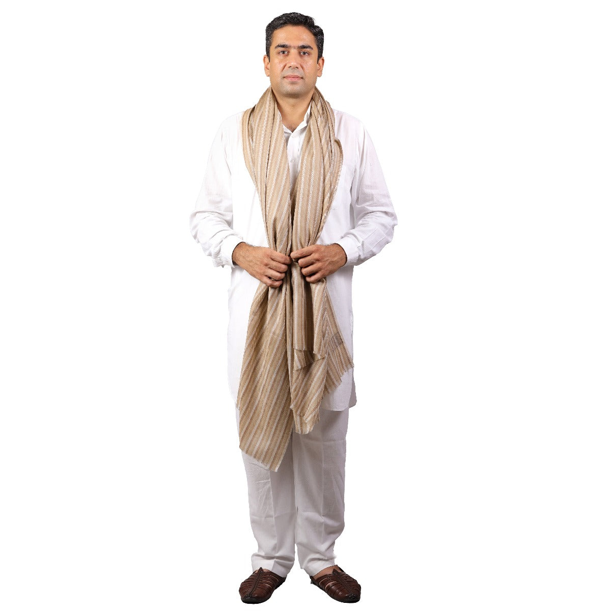 The neutral tones and classic striped pattern make it a versatile accessory that complements traditional, ethnic, and western wear alike. Whether draped over the shoulder with a kurta, wrapped around the neck over a blazer, or styled as a stole with a saree or suit, this shawl enhances any ensemble.
