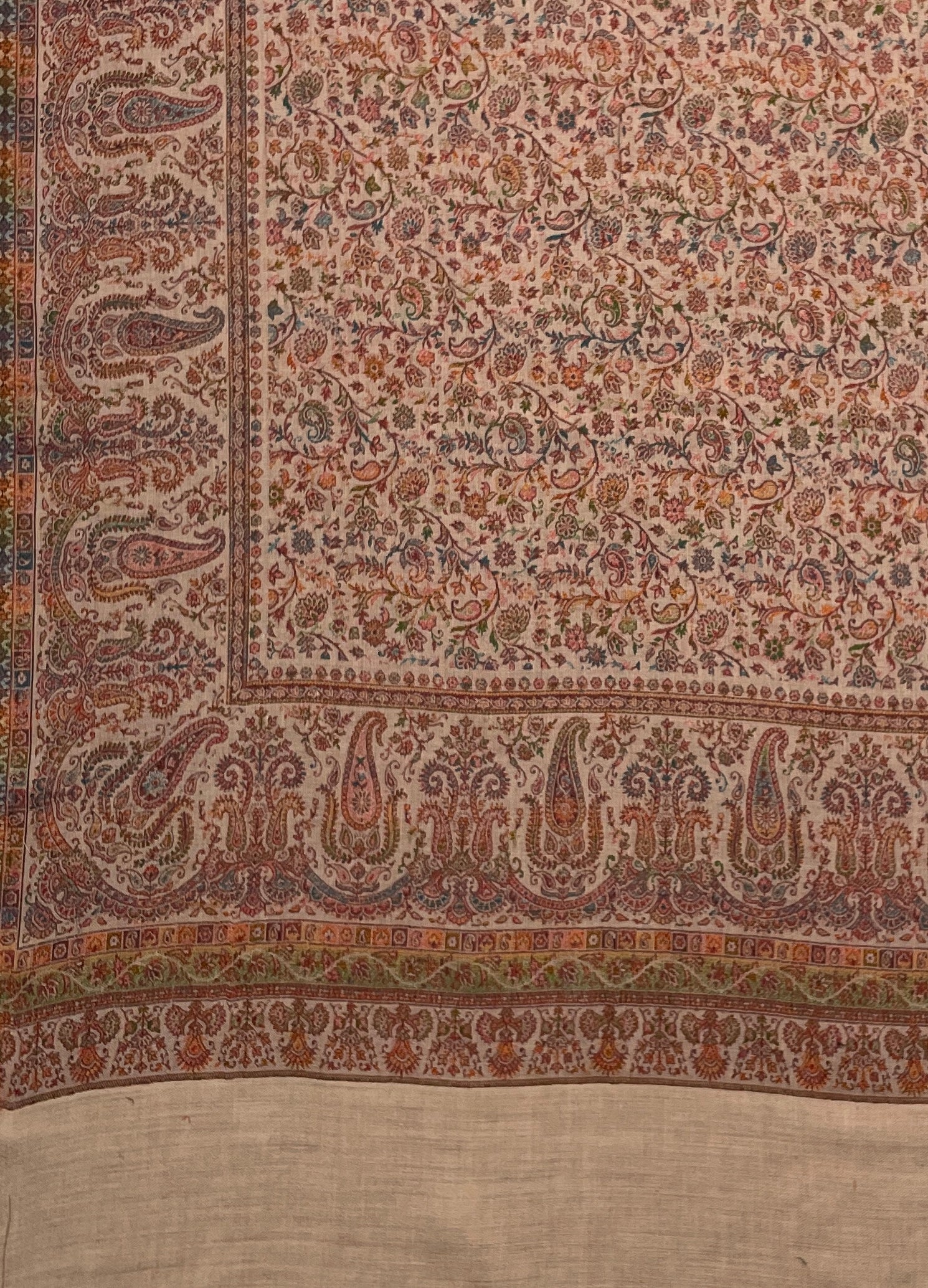 Handwoven with precision, this shawl showcases a continuous jaal pattern that flows seamlessly across the fabric, giving it a rich, heritage-inspired character. Each paisley motif is delicately detailed, reflecting the finesse of Kashmiri weaving traditions while offering a modern, graceful drape.