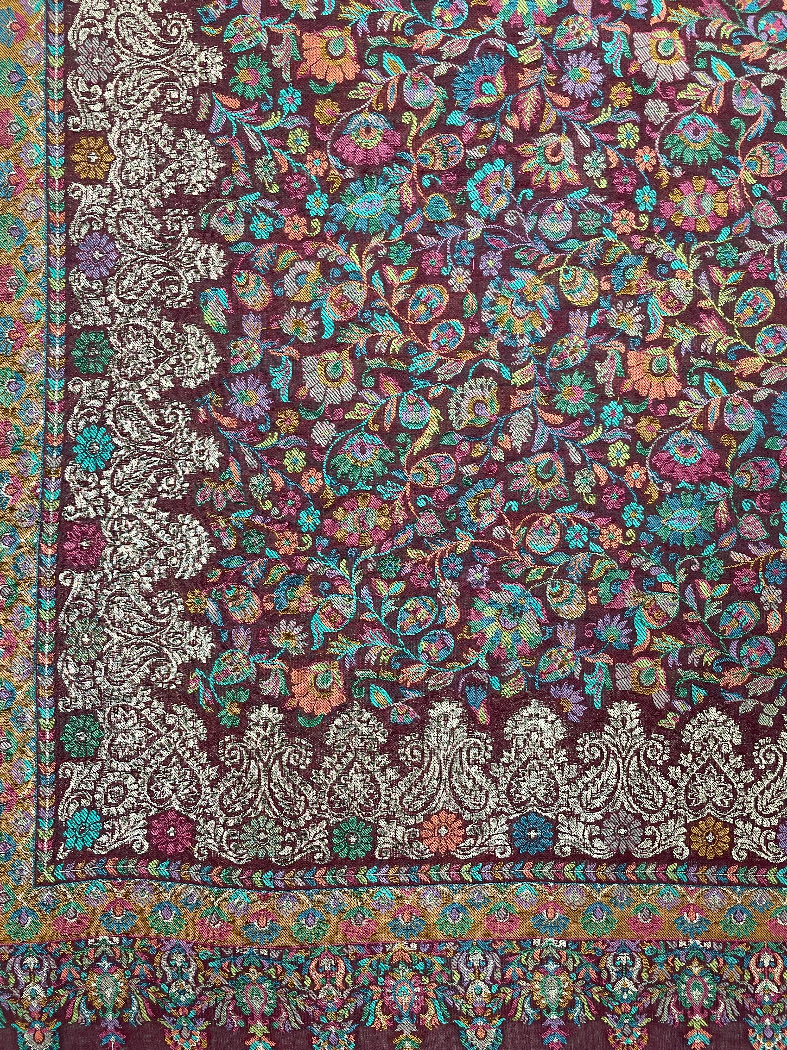 The ornate borders, woven with precision, frame the shawl like a work of art, adding depth and refinement without overpowering its elegance. A highlight corner motif adds a signature touch, making the design feel curated and distinctive.