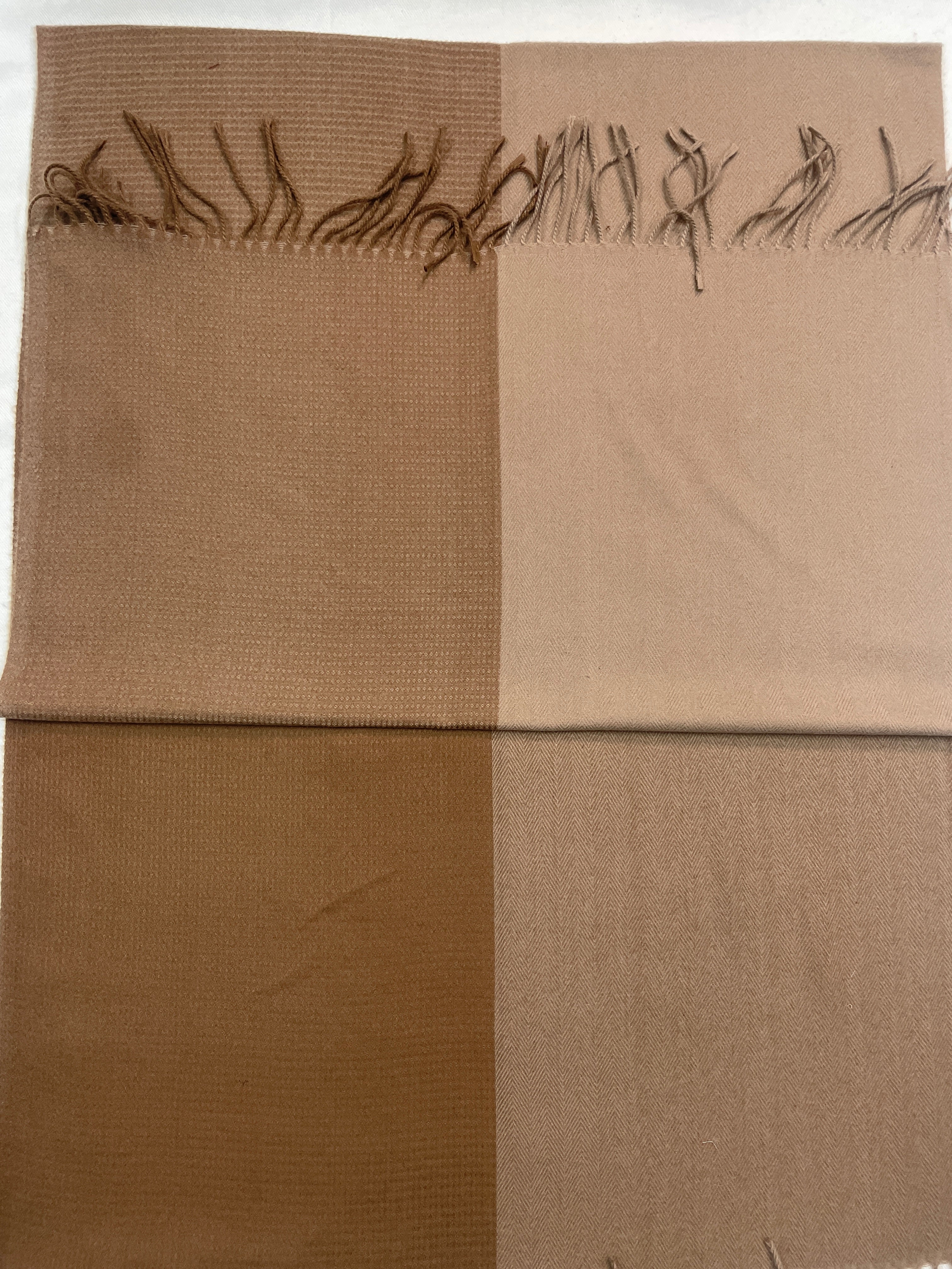 The scarf features a striking two-tone design, seamlessly blending a rich camel brown with a lighter, sandy shade. This color palette is not only timeless but also incredibly adaptable, making it a perfect match for neutral-colored clothing such as creams, beiges, and charcoals. The darker hue grounds the piece, while the lighter tone adds a soft, warm highlight, creating a balanced and visually appealing contrast. The color transition is subtle, giving the scarf a cohesive and polished appearance.