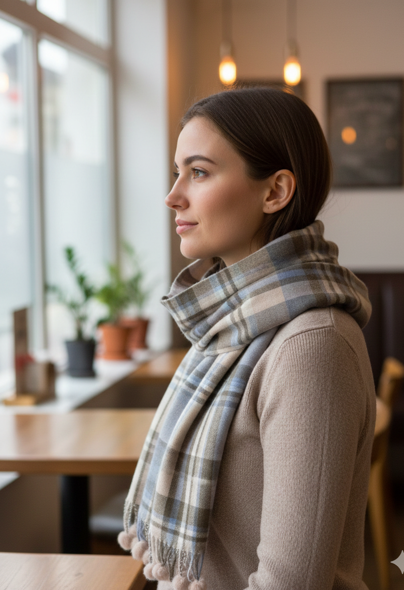 Crafted from soft, breathable wool, it provides gentle insulation without feeling heavy, making it ideal for long winter days. The neutral color palette allows easy pairing with both formal and casual outfits—whether draped over a coat, styled with a sweater, or worn as a refined travel accessory.